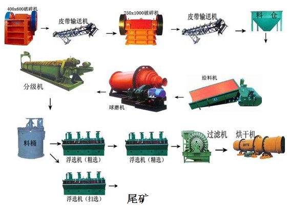 硫化物-萤石类型矿石:原矿破碎-磨矿-优先浮选硫化矿物-尾矿浮选萤石-萤石粗精矿多次精选。
